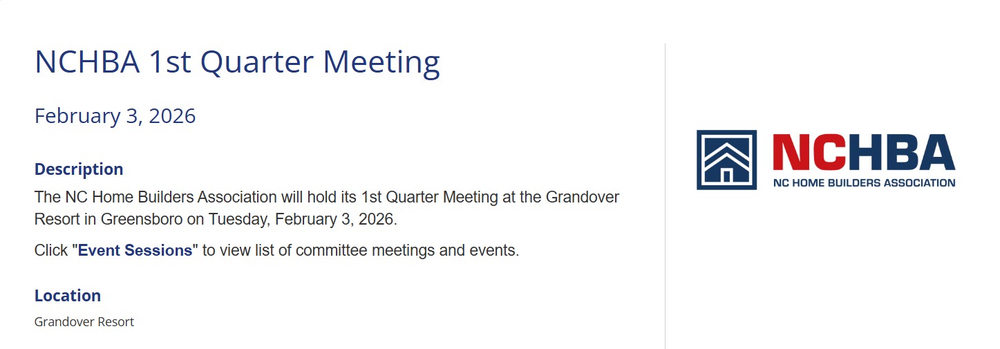 The NC Home Builders Association will hold its 1st Quarter Meeting at the Grandover Resort in Greensboro on Tuesday, February 3, 2026.